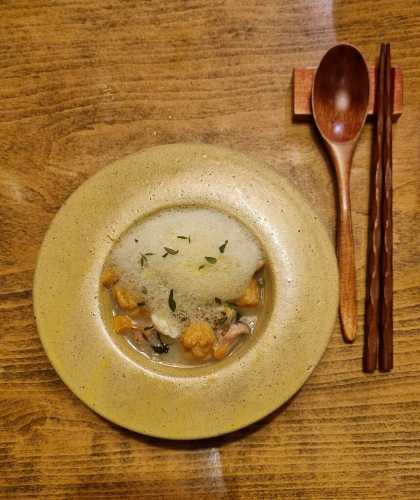 Dentro de su menú está el aromático y cautivador Congee [sopa de arroz China] que te abraza con su tibieza y cremosidad. Este lienzo de arroz sobrecocido se mezcla con unas albóndigas de cojinova del norte, picorocos frescos y almejas de la Quinta Región salteadas, evocando el mar que se fusiona con cítricos, un amargor sutil y un final floral. Su té es un Blanco de Huayopata, del Cusco, Perú, de notas a manzanilla y flores silvestre blancas, muy delicado, de baja astringencia, que levanta lo floral del plato. En tanto, el vino es un Riesling de Sierra de Bellavista, del valle de Aconcagua que conversa desde el lado marino y cítrico.
