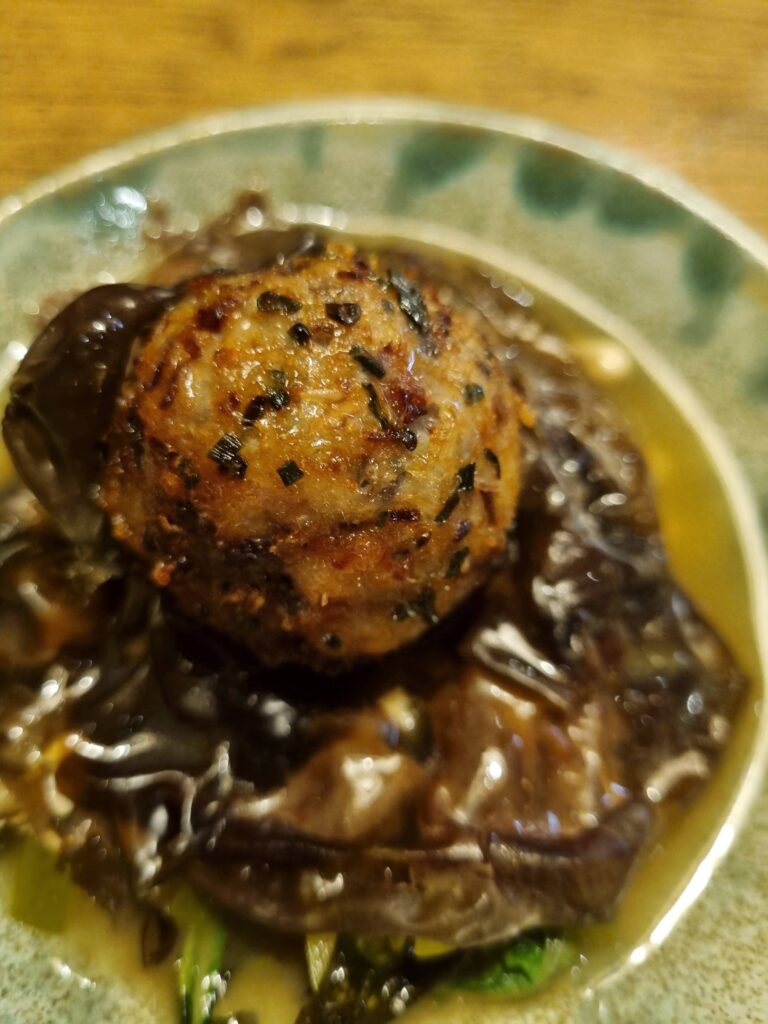 Le sigue Breca, un pez de Juan Fernández, que aparece envuelto en un tempurizado suave sobre una cama de kimchi blanco que nada en un caldo de mariscos con mostaza fermentada, ají oro y aceite de pimienta Sechuán que no pasan inadvertidos. Un repollo chino salteado al wok le regala algo de humo. La explosión de sabores es manejada por un té negro Ruby 18 de Sun Moon Lake, Taiwán, con notas herbales y especiadas, cacao y canela, de espíritu indio. El otro camino es un untuoso Aristos Baronesa, un Chardonnay del Limarí, con un dejo de mantequilla, pero también algo verde, fruta con carozo y flor blanca. En el mundo del sake está Hanagaki Kimoto, Junmai Koshu, de Fukui, Japón, que asemeja a un bourbon, dado que es guardado en barrica de roble americano, por lo que hace match desde su perfil seco, notas a chocolate, caramelo y vainilla, que son un must cuando se trata de fritura y ahumados.