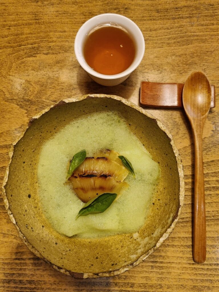 Lo dulce no deja de sorprender. Una notable Piña llega como jalea, asada en un sashimi y en un sorbete. Un crumble de jengibre, trigo mote frito, un aire de albahaca y hojas frescas de esta misma hierba contribuyen a refrescar y potenciar sabores y texturas. Black Lishan, un té negro de Lishan, Taiwán, de alta oxidación, que transmite algo de piña y lichi, es un gran partner, mientras que en el mundo del vino lo hace un Semillón de Garage del Maule. Las burbujas juguetonas de Gassan Sparkling Cloud, de Shimane, Japón, que se fermenta con método tradicional, en botella y sobre sus lías, que le entregan un cuerpo cremoso y envolvente, dejan sentir pera, pétalos de rosa y miel, refrescando aún más.