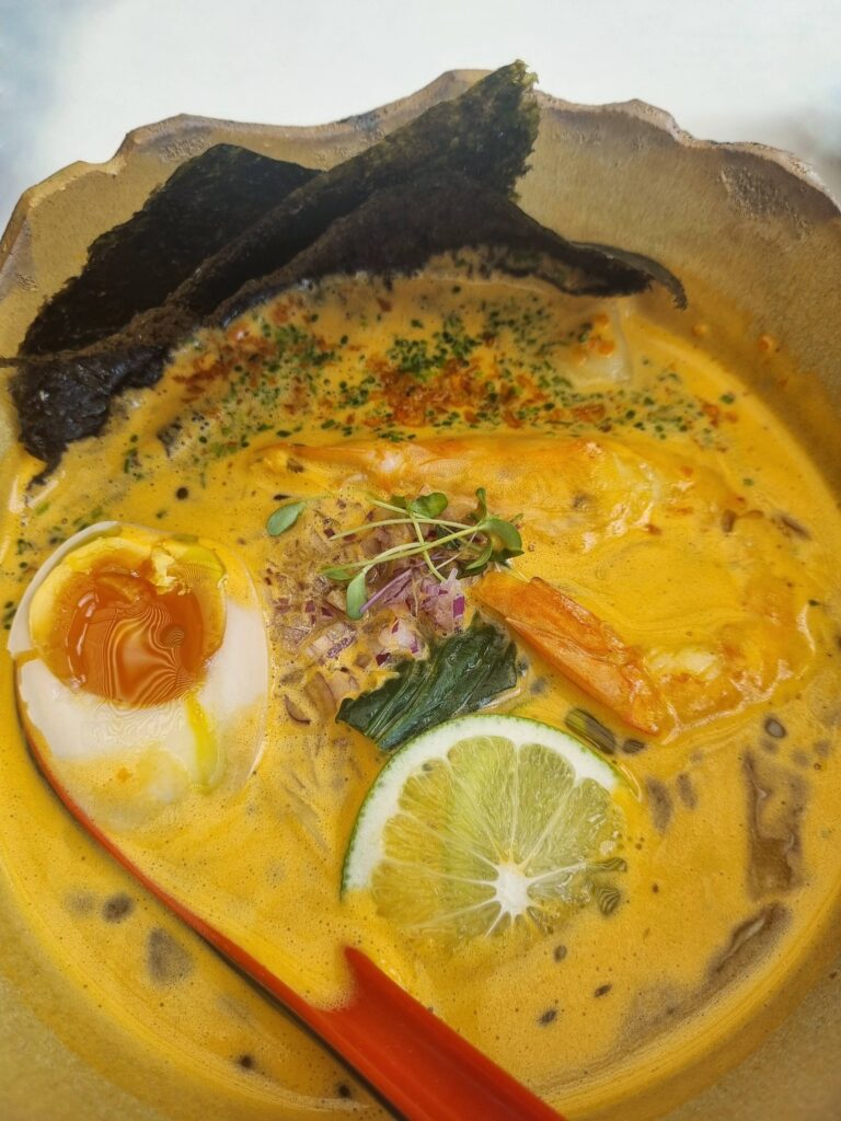 Ebi Ramen. Se incorporó hace un par de días y es un imperdible. Con posibilidades de generar adicción. Ya de entrada te seduce un imponente langostino salteado en batayaki, el típico huevo en su punto y unas algas nori que contrastan con un caldo amarillo, hecho con leche vegetal, que revela cierto punto cítrico que le regala frescor, siendo profundo y reconfortante, con capas de sabor que te hacen querer cucharear hasta el final. Estás en eso cuando aparecen unos edamames al dente, unas pastas propias y otro gran tesoro, un buen wontón de camarón.