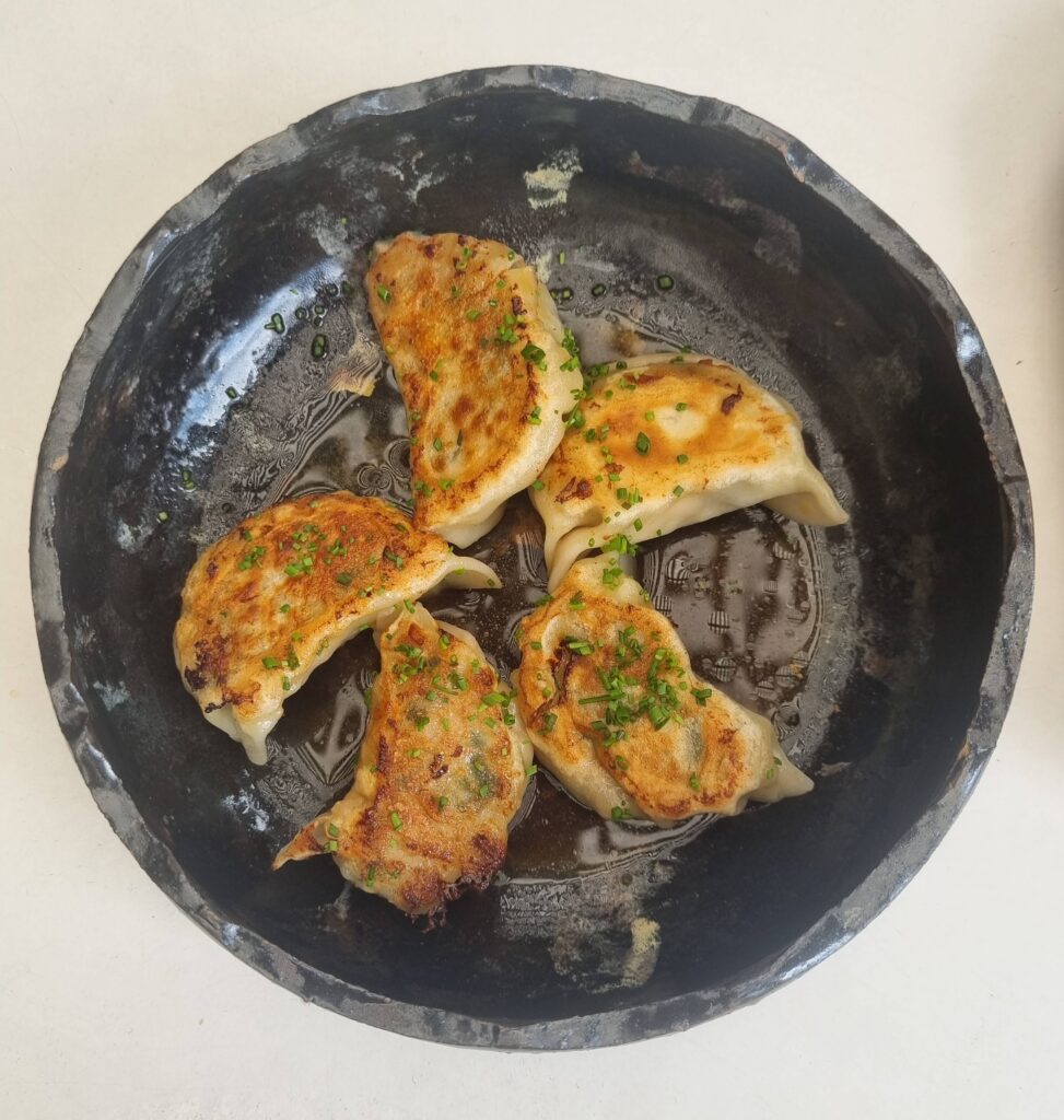 Gyozas La Rusia. Se cocinan con la técnica tradicional, es decir, al vapor y selladas por un lado, y van acompañadas de una salsa. En este caso una aromática ponzu de elaboración propia que sirve de base para esta masa crocante y suave a la vez que va rellena de un cerdo molido que toma otra personalidad por un toque verde y cítrico que lo acompaña. Luego se eleva aún más gracias a un picor coqueto que queda en el final.