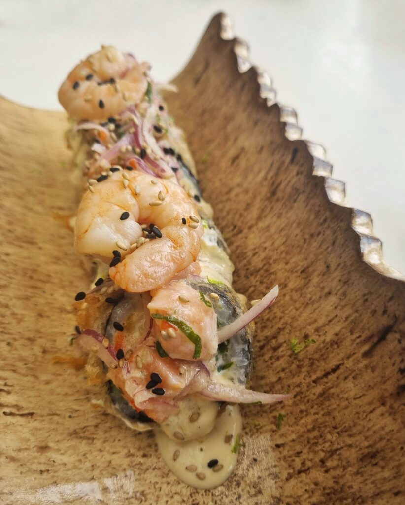 Sake Tartar. Está en la carta del día uno, de cuando ambas trabajaban en su casa. Por su historia y sabor es uno de los inamovibles. Es parte del mundo de los acevichados, pues encima tiene un puré de palta y tartar de salmón, que refresca. Dentro lleva camarón furai, queso crema y cebolla morada, que regala crocancia y frescor, pero además va envuelto en nori crocante, lo que le entrega otra sexy capa crunchi. Aun cuando posee muchos ingredientes, se integran logrando un enjundioso equilibrio muy representativo al estilo nikkei.