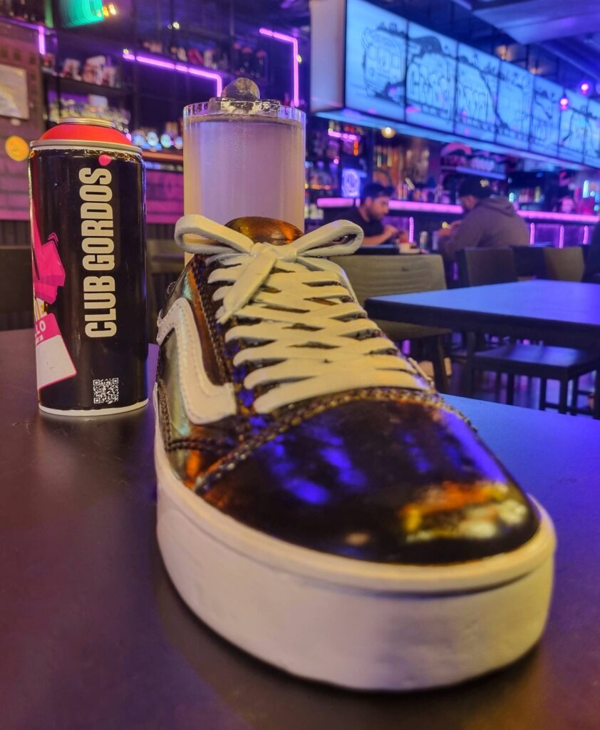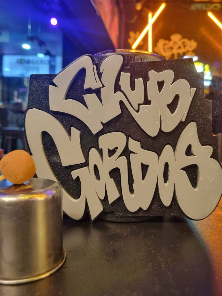 La experiencia en Club Gordos de Vitacura comienza un poco antes de cruzar la puerta. Cuando ves el clásico caminante de la marca de whisky Johnnie Walker pintado de fucsia e intervenido eso ya te pone en onda. Al entrar te pasan un aerosol para que le escribas tu nombre y así personalizar la experiencia, que puedes disfrutar en su primer salón o en su terraza escondida, a la que puedes acceder gracias al spray que te sirve de llave para atravesar una puerta secreta. Ambos están llenos de graffitis realizados por uno de sus socios con colaboraciones internacionales, como la del argentino Pomps.