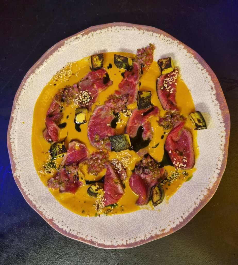 Otro es su aromático y colorido Tiradito de Res y Ají Amarillo Ahumado con una carne marinada en ponzu, que le otorga mayor profundidad, sin embargo, al tener algunos cortes un tanto fibrosos podría dificultar un poco comerlo, lo que se perdona por la adictiva combinación de sabores que nacen de la mezcla de su leche de tigre, de discreto picor, trozos de palta asada, que le aporta un ahumado leve y no invasivo, cebolla morada cortada en pequeños cubitos que refresca y da crocancia, semillas de sésamo tostadas y aceite de perejil y espinaca. Cuando se junta todo es una explosión que te deja con ganas de cucharear hasta el final.