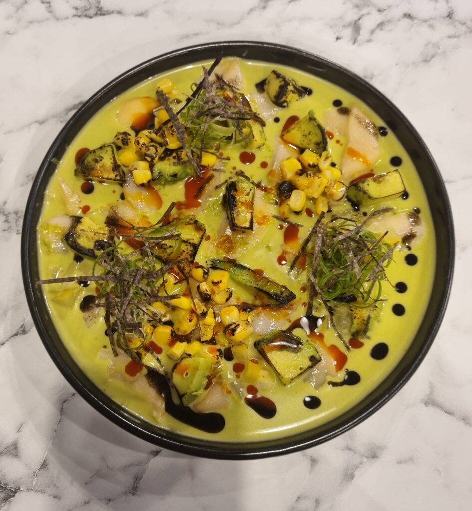 Aguachile. Un plato nada tímido que tiene a las chochas [molusco parecido a la almeja] de Tongoy como protagonistas. Son cocinadas en sous vide, las que no pierden frescura y logran turgencia, con capas de sabor. Estas se potencian con una eléctrica dosis de aguachile [base de pepino y jalapeño] de picor coqueto; palta tatemada, que le entrega un leve ahumado; choclo; trozos de limón lactofermentado, para elevar lo cítrico, aunque dispara un tanto el amargor; cebollín y aceite de carbón, con una nota terrosa.