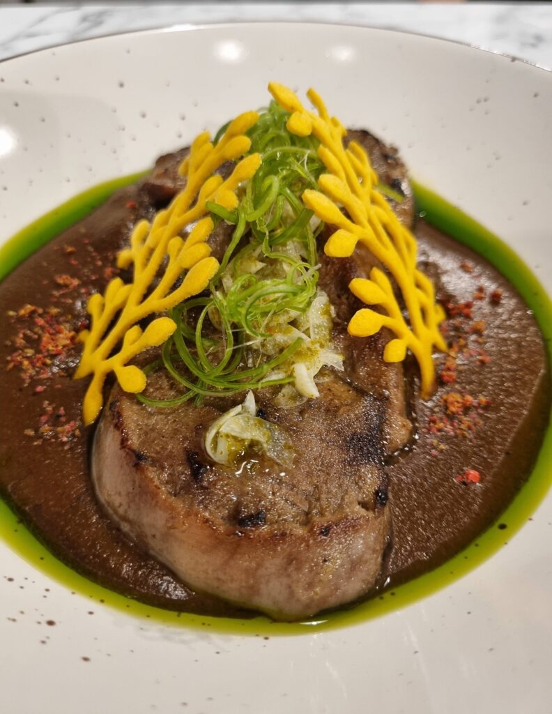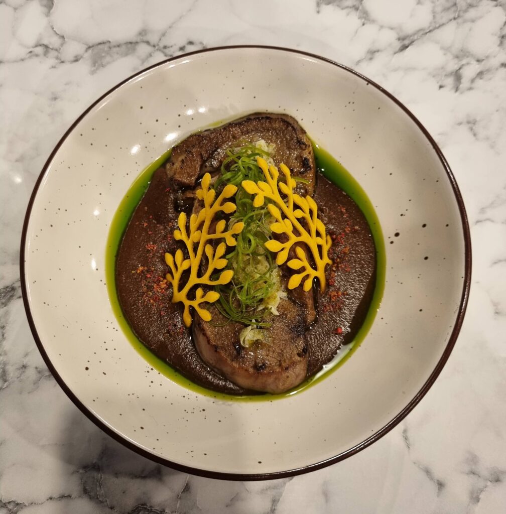 Lengua y Mole. Esta receta es muy interesante, dado que cuenta con el mole, preparación mexicana, pero tratada con ingredientes locales. Esta salsa espesa es elaborada en Aurorus con 25 insumos nacionales, varios de la zona, como cochayuyo, pecanas, algarroba, muña, papaya y chancaca. Lo interesante es que se logra la misma textura sedosa, cierto picor y esa evocación al cacao que tiene la receta original, permitiendo sentir varios de los productos que le dan vida. Va con una lengua cocinada por 24 horas que llega suave y elegante. Gran match.