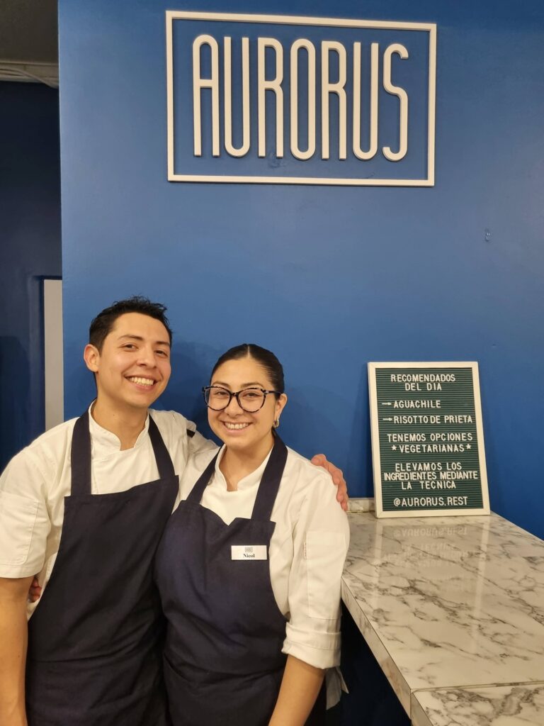 Aurorus nace con la historia de amor entre Nicol Cisternas y Cristopher Saldaño. Se conocieron en el 2020 en una cocina de La Serena. La pandemia los obligó a salir de su zona de confort y comenzaron a hacer encurtidos, panes y chocolates. Ese paso les abrió la mente y las ganas de tener lo propio. Ahí se gestó este proyecto bautizado por una sobrina en honor a un pokemón, esas conocidas criaturas ficticias de fama mundial. En octubre de 2022 se lanzaron con las cenas clandestinas. Para su sorpresa fue un éxito y al poco andar comenzaron a tener lista de espera. Y mucha. Ese fue el impulso para aventurarse a establecerse. Por esas casualidades de la vida, o quizás no, se instalaron en enero del 2025 en un pequeño local que está algo escondido dentro de un centro comercial en El Milagro, en La Serena. Pero aún así no han perdido la costumbre de hacer un menú secreto, el que realizan periódicamente.