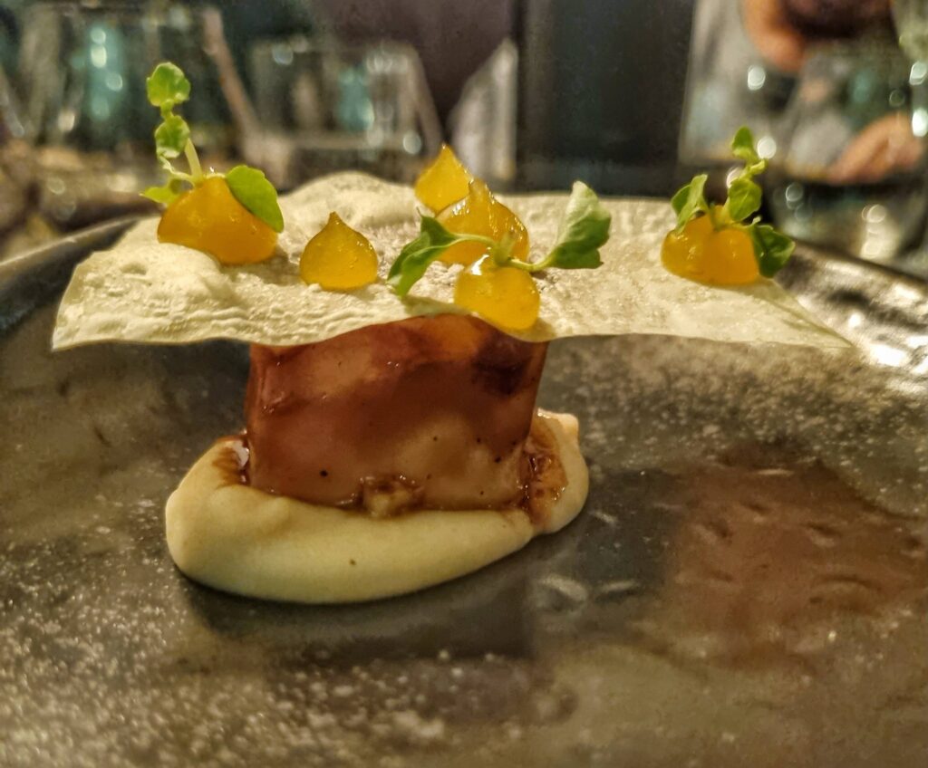 Caracol de mar pata de burro del Caribe colombiano. Viene frito y acompañado de un puré de semillas de calabaza, jícama, sésamo, nori y Estrella Chayote encurtida [verdura con muchas propiedades antioxidante que se encuentra en el Caribe], lo que da como resultado una receta de sabores elevados, fresca, cremosa, con algo de picor y cierta crocancia. El cocktail que acompaña, Samper Mendoza, hace alusión al mercado de hierbas de la ciudad que solo abre de noche, por eso, va con gin colombiano Selva, aromática de hierbas en base de viche [destilación del jugo fermentado de la caña de azúcar] del Pacífico, hoja de coca, fernet Branca y helechos baby.